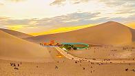 In the depths of the desert in Dunhuang, the mesmerizing scenery of the splendid Singing Sand Dunes embracing the Crescent Spring will take your breath away. These undulating dunes feature a "singing" sound as the winds rise, and the clear spring embedded within adds to the allure. From the top of the 1700-meter-high dune, the oasis below is a sight to behold.