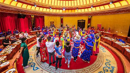 Later, travel to the famed Resonant Sand Gorge. Nestled amongst towering dunes and canyons lies an insight into the lives of local Ordos people. Hop on the sand train for a scenic ride through the gorge's colorfully carved valleys. Watch as a bedazzling Ordos wedding celebration puts community spirit on display. Unwind with a camel ride across rippling desert dunes under the sun.